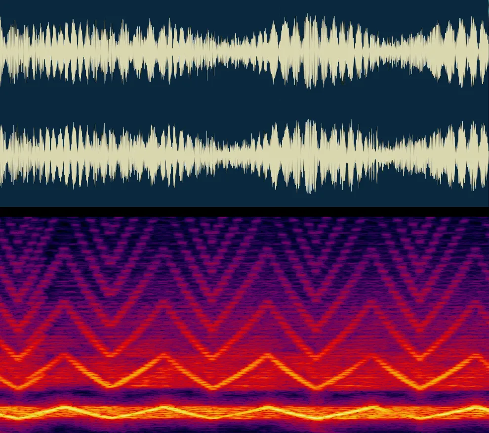 > On both plots, the horizontal axis represents time. In the bottom image, the vertical axis represents frequency and pixel color represents intensity.